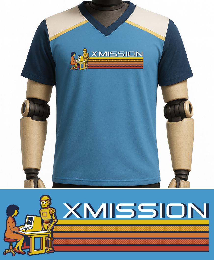 This v-neck tee featurines the classic tech duo: a woman at a terminal and a golden robot. Nostalgic old-school cool. Signature locker loop at back neck.
